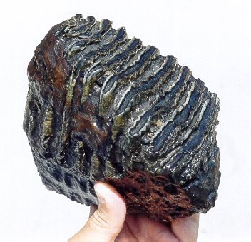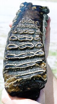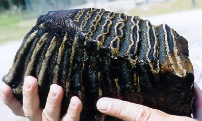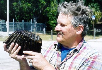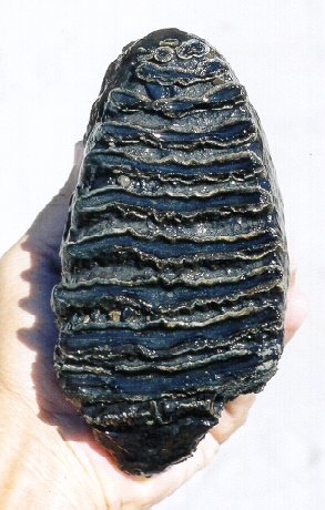 Dave Ward found the mammoth tooth shown above (three angles) in the Peace River in May 2001, and the mastodon tooth in the same river in 2000.